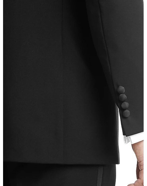 A grosgrain-faced lapel enhances the refined style of this all-black formalwear staple. Flat-front trousers feature a grosgrain stripe down the leg adding polish to the timeless look.