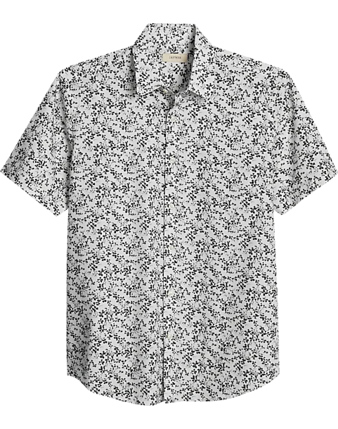 Enjoy the warmer days in this woven cotton camp shirt by Jaymes. The shirt, which features a clover pattern in black, is cut roomy and boxy to help you stay cool and comfortable.