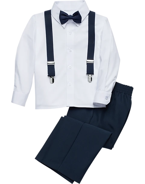 This all-in-one formal outfit for your little gentleman will have him ready for his next big event with ease and no fuss. This set includes a shirt, bow tie, pants, and suspenders.