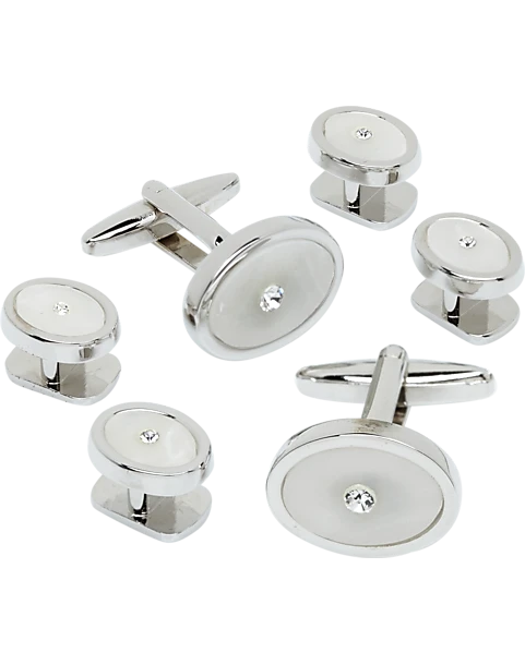 Change up the look of your formal attire in an instant with this cufflink and stud set, featuring a round iridescent white center and framed in silver.