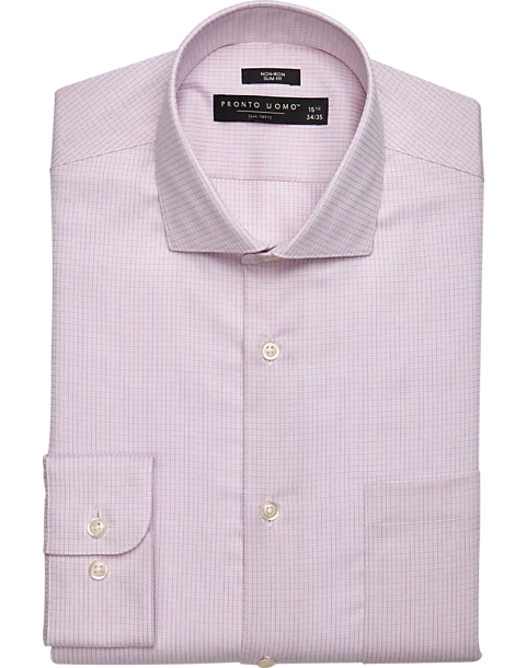 In a handsome check pattern, this dress shirt from Pronto Uomo adds the just-right look, paired with your suits or dress slacks. The slimmer-cut fit provides that European-style tailoring that’s so attractive. The no-iron material goes right from the dryer to the hanger. Slim Fit is slim and tapered across the chest, shoulders, armholes, waist and sleeves without compromising on comfort. Recommended for more triangle body types (broad shoulder and chest, narrow waist and hips).